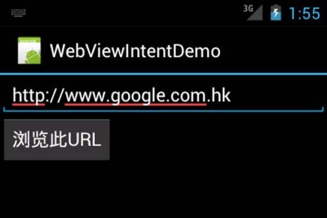 - 导入“WebViewIntentDemo”的安卓工程,建立如下图所示的界面,布局界面如图,当用户在文本框中输入 Web 地址后,通过点击“浏览此 URL”按钮,程序根据用户输入的 Web 地址生成一个Intent,并以隐式启动的方式调用 Android 内置的 Web 浏览器,并打开指定的 Web 页面。本例输入的 Web 地址 http://www.google.com.hk,打开页面后的效果如图