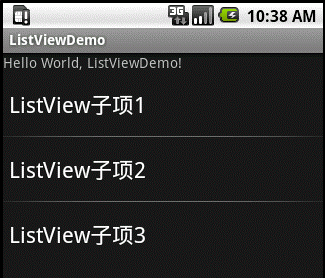 - 导入“ListViewDemo”的安卓程序,建立如下图所示的界面,界面包含 TextView(id:TextView01) 和 ListView01 (id: ListView01)两个按钮,ListView01 中所显示的内容“ListView 子项 1、ListView 子项 2 ListView 子项 3”并单击相应菜单项时 TextView 显示相应菜单名称,请分别在 main.xml 和ButtonDemoActivity.java 补充程序: